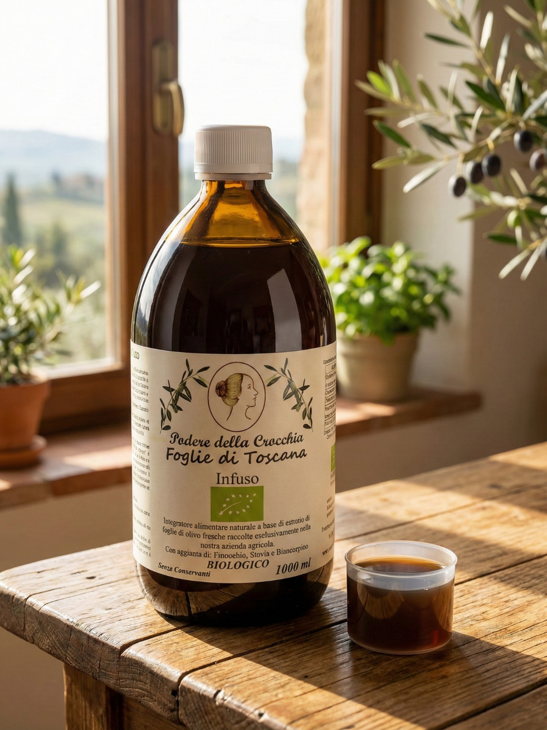 Olivenblätter (Gesamtpolyphenole >4 g/Liter, davon Oleuropein >80 mg), Weißdornblätter und -blüten, Fenchelfrucht, wässriger Extrakt aus Olivenblättern, titriert auf 4 % Oleuropein, Steviablätter.
